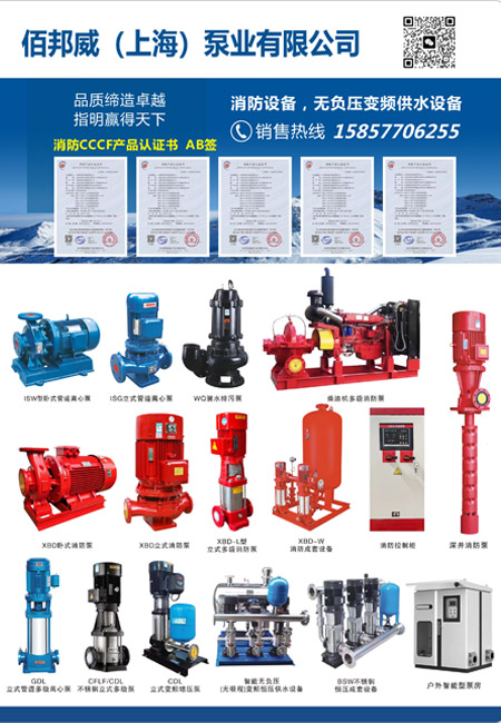 佰邦威(上海)泵业有限公司主要产品有管道离心泵、多级离心泵、消防泵、吸泵、防管道式排污泵、潜水排污泵、液下式排污泵一高楼生活供水设备、水泵电气控制装置等